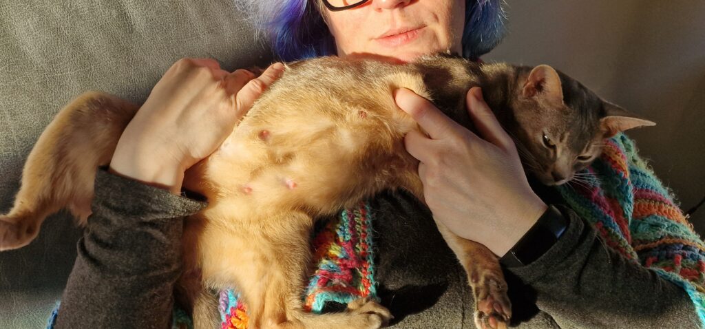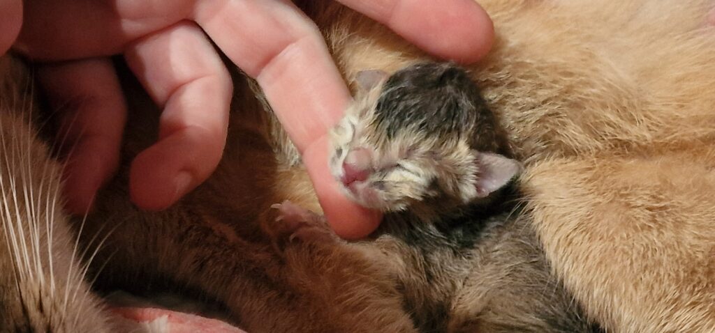 En zo’n bevalling is ook niet zo gepiept. Rond kwart voor zes begonnen de persweëen, en tegen een uur of zes – bij het krieken van de ochtend – verscheen daar dan eindelijk haar eerste kitten. Een blauwe dochter, 105 gram.