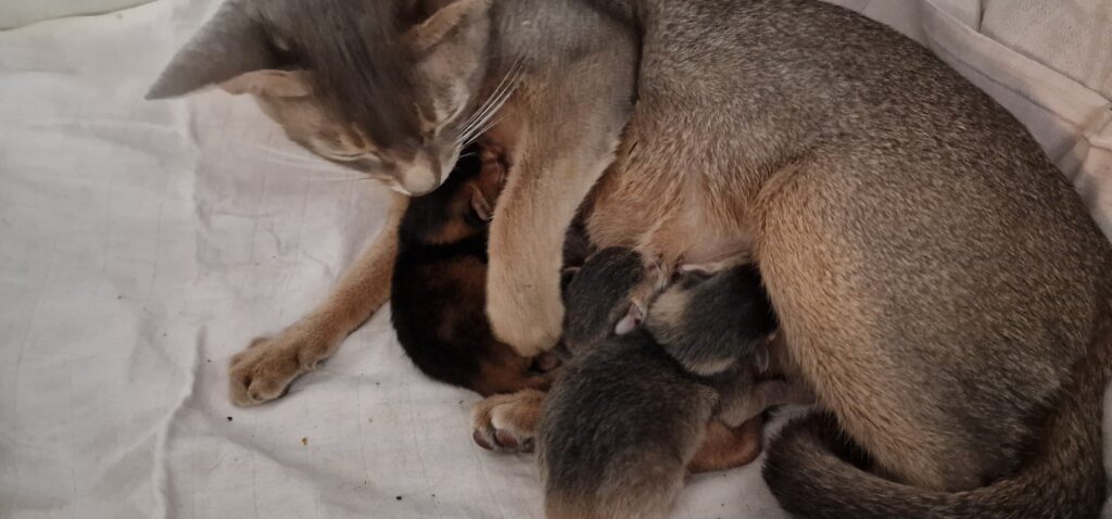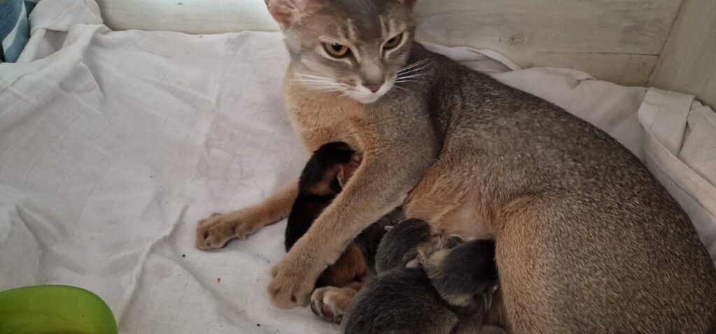 En wat een goede moeder is ze. De kittens krijgen alle ruimte op zoek te gaan naar een tepel – waar ondanks de grote voorraad toch nog om gevochten wordt – en moeders is ondertussen zeer alert, grommend naar ieder geluidje dat in de baarkist doordringt. Ook is ze erg chatty, vooral met Barbara, met wie ze hele dialogen uitwisselt.