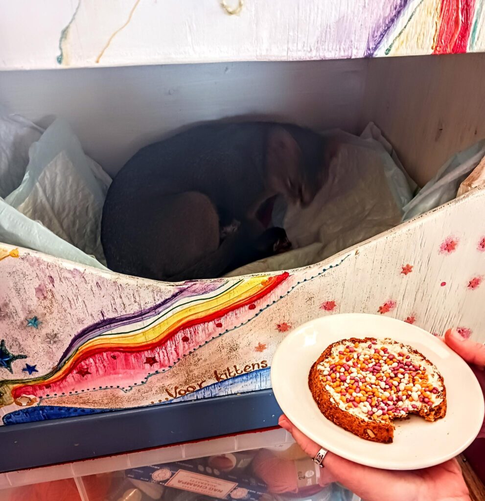 Katten zijn nachtdieren – dus ook het ter wereld brengen van kittens gebeurt ’s nachts. Ik werd op gisterenochtend (zaterdag 29 maart dus) rond kwart voor vijf ruw uit mijn dromen gewekt – de zon was nog niet op en mijn lijf schreeuwde ‘ga terug naar bed!’. Gelukkig is er dan altijd koffie voor de broodnodige oppepper.