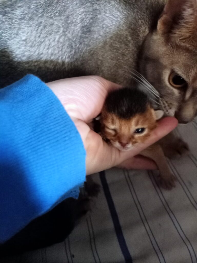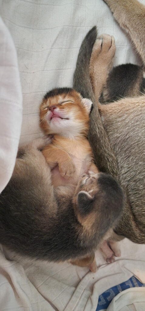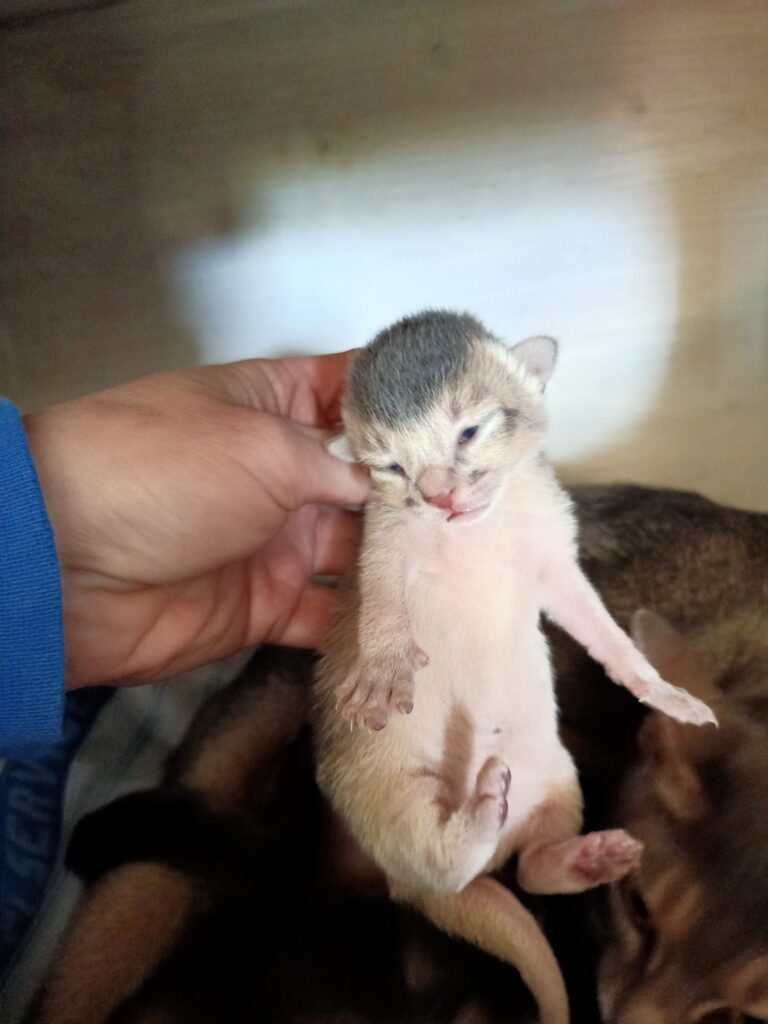 Dan hebben we nog de ontwikkeling van de kittens… Online en in de boekjes staat ‘de oogjes en oortjes van de kittens gaan open rond de 10 dagen’. Nou, daar dacht het wildkleur meisje anders over! Die trok gewoon op dag 4 haar linker oog wagenwijd open. De blauwtjes gingen wat rustiger aan de slag met een ooghoekje dat steeds ietsje wijder kwam te staan.