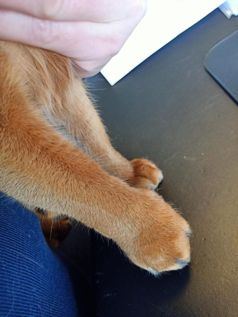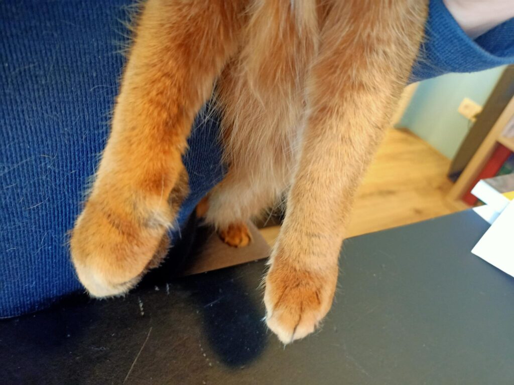 Ik (Barbara) zit boven te werken, de katten zijn beneden en in de tuin met de deur open want het is heerlijk weer. Opeens denk ik een ‘MAUW’ te horen dus ik spring overeind en ren de trap af (“is er ruzie?” “gaat Ronja bevallen?” “zit er een vreemde kat op de schutting?”). Ik kom beneden en iedereen is in rust, ze kijken me verstoord aan ‘wat kom jij nou ineens doen?’. Het geluid zal wel een van de 10.000 meeuwen zijn die hier vliegen en mauwen en doen. Maar, ik tref wel een heel vrolijk Snootje aan, met een wat groter pootje dan normaal… Een foto maken is dan wel weer heel vervelend want dan moet je stil zitten, dus in een houdgreep met links en om een hoekie met de telefoon met rechts toch wat plaatjes van de Snoot met de poot gemaakt… Mormeltje!